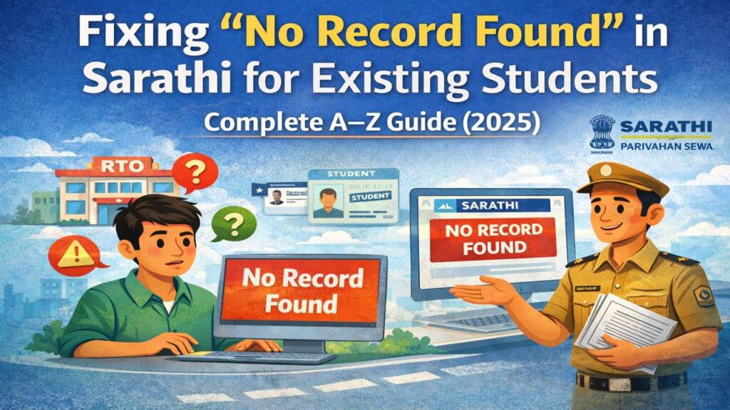 The message “No Record Found” in Sarathi usually appears when an existing student or applicant tries to access their Learner Licence (LL) or Driving Licence (DL) details online. This does not always mean your data is deleted. In most cases, it is a technical or data-matching issue.